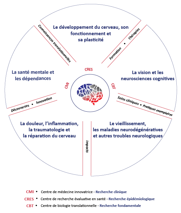 Nos scientifiques étudient les voies moléculaires complexes aidant les cellules nerveuses à grandir et à se connecter entre elles, ils tracent des réseaux sur l’ensemble du cerveau qui soutiennent les fonctions motrices, sensorielles, cognitives et affectives et ils appliquent ces connaissances dans le but de gérer et de traiter les troubles du système nerveux. Notre recherche est intégrée avec des paramètres cliniques sur plusieurs sites de recherche.
