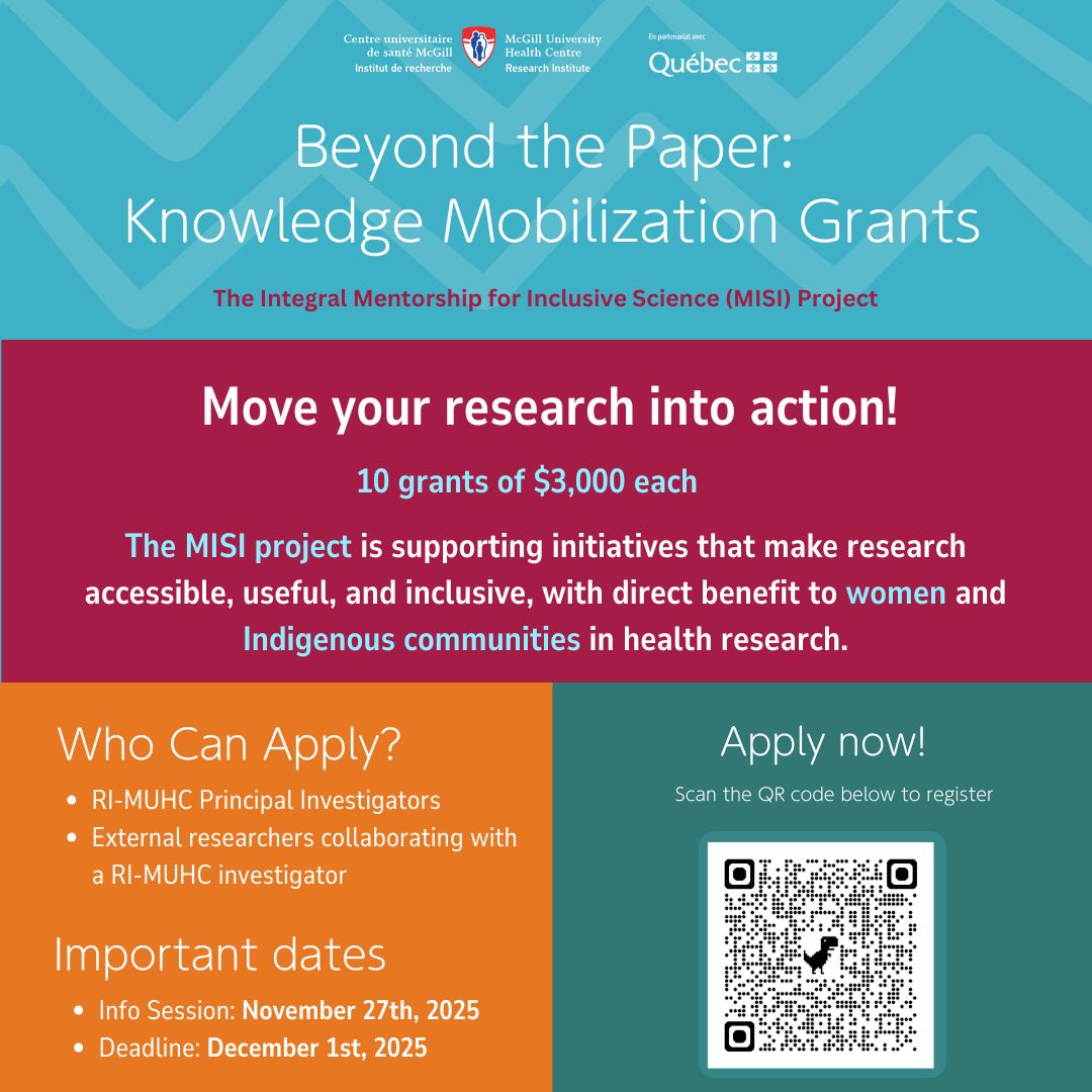 The Beyond the Paper – Knowledge Mobilization Grants for Inclusive Science competition supports RI-MUHC researchers in transforming research into meaningful impact. Funded through the Integral Mentorship for Inclusive Science (Mentorat intégral pour la science inclusive, MISI) project, this initiative will award 10 grants of $3,000 each to support the development of innovative, inclusive, and community-engaged knowledge mobilization (KM) projects.