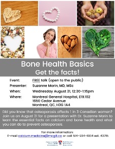 Where: Montreal General Hospital of the MUHC (E19.102), 1650 Cedar Avenue, Montreal, Quebec H3G 1A4 When: Wednesday, August 31, 2016 from 12:30 p.m. to 1:15 p.m. Did you know that osteoporosis affects one in three Canadian women? Join us on August 31 for a presentation with Dr. Suzanne Morin to learn the essential facts on calcium and bone health and what you can do to prevent osteoporosis. For more information: The presentation will be delivered in English. |