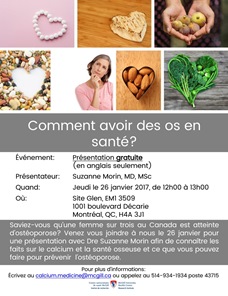 Saviez-vous qu’une femme sur trois au Canada est atteinte d’ostéoporose? Venez vous joindre à nous le 26 janvier pour une présentation avec Dre Suzanne Morin afin de connaître les faits sur le calcium et la santé osseuse et ce que vous pouvez faire pour prévenir l’ostéoporose. Quand : le jeudi 26 janvier 2017 de 12 h à 13 h Pour de plus amples informations : La présentation sera en anglais. |