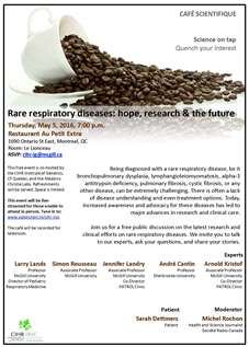 Join us for a free public discussion on the latest research and clinical efforts on rare respiratory diseases. We invite you to talk to our experts, ask your questions, and share your stories. Where: Restaurant Au Petit Extra, 1690 Ontario St East, Montreal, QC, Room: Le Lionceau When: Thursday, May 5, 2016, 7:00 p.m. Moderator: Michel Rochon, Health and Science Journalist, Société Radio-Canada Experts: Patient: Sarah Dettmers Admission is Free. RSVP: cihr-ig@mcgill.ca This free event is co-hosted by the CIHR Institute of Genetics, CF Quebec, and the Meakins-Christie Laboratories. Refreshments will be served. This event will be live-streamed for those unable to attend in person. Tune in to: www.vpsolution.tv/cihr-irsc |