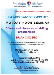 Where: At the Research Institute of the McGill University Health Centre (RI-MUHC) Glen Site, RI Auditorium, E.S1-1129, 1001 Decarie Boulevard, Montreal, Quebec H4A 3J1 Invited Speaker, BRIAN COX, PHD Assistant Professor, Department of Physiology, Faculty of Medicine, University of Toronto Of mice and placentas, modelling preeclampsia Info: Noha Gerges, PhD |
