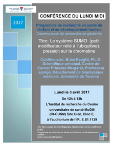 Où : L’Institut de recherche du Centre universitaire de santé McGill (CUSM), site Glen, à l’auditorium de l’IR, E.S1-1129, 1001 boulevard Décarie, Montréal, Québec H4A 3J1