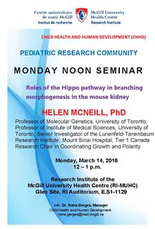 Where: At the Research Institute of the McGill University Health Centre (RI-MUHC) Glen Site, RI Auditorium, E.S1-1129, 1001 Decarie Boulevard, Montreal, Quebec H4A 3J1 Invited Speaker: HELEN MCNEILL, PHD Professor of Molecular Genetics, University of Toronto, Professor of Institute of Medical Sciences, University of Toronto, Senior Investigator of the Lunenfeld-Tanenbaum Research Institute, Mount Sinai Hospital, Tier 1 Canada Research Chair in Coordinating Growth and Polarity Roles of the Hippo pathway in branching morphogenesis in the mouse kidney Info: Noha Gerges, PhD |