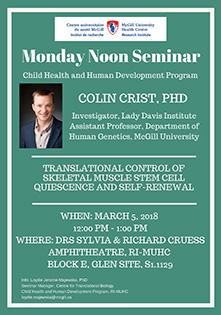 L’Institut de recherche du Centre universitaire de santé McGill (IR-CUSM), site Glen, à l’amphithéâtre Drs Sylvia & Richard Cruess, E.S1-1129, 1001 boulevard Décarie, Montréal, Québec H4A 3J1
