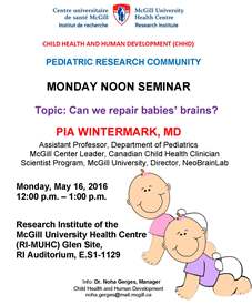 Where: At the Research Institute of the McGill University Health Centre (RI-MUHC) Glen Site, RI Auditorium, E.S1-1129, 1001 Decarie Boulevard, Montreal, Quebec H4A 3J1 Invited Speaker: PIA WINTERMARK, MD Assistant Professor, Department of Pediatrics McGill Center Leader, Canadian Child Health Clinician Scientist Program, McGill University, Director, NeoBrainLab Can we repair babies' brains? Info: Noha Gerges, PhD |