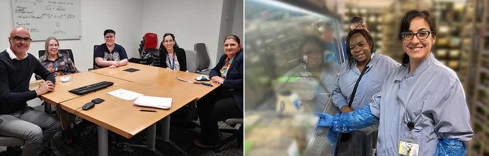 (L) Quinn Leaves (centre) joins an RI-MUHC team for roundtable discussion. (R ) Sylvie-Mireille Bambi works with technician Carla Iacovelli.