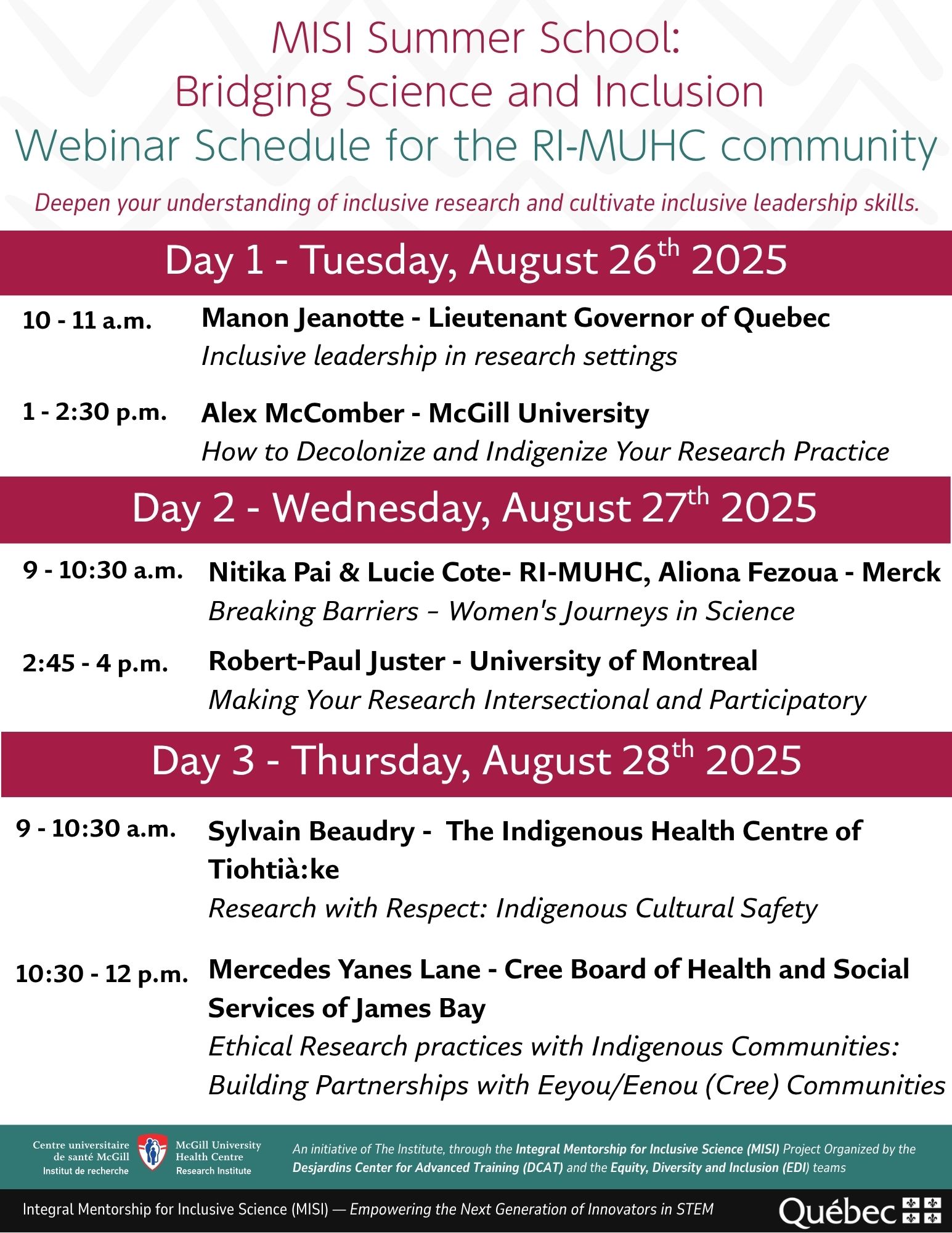 From August 26 to 28, The Institute’s EDI and DCAT teams invite you to a series of virtual conferences on inclusive research practices and ethical engagement with Indigenous communities. This series is part of Summer School: Bridging Science and Inclusion of the Integral Mentorship for Inclusive Science (Mentorat intégral pour la science inclusive, MISI) project. MISI aims to increase the participation and success of women and Indigenous students in health research training.