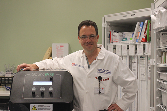 Développé par la compagnie québécoise SoundBite, le SoundBite™ Active Wire est un fil-guide relié à un générateur d’ondes de choc. Fonctionnant comme un marteau-piqueur, le dispositif peut, de manière contrôlée, traverser le blocage artériel, tout en laissant intacte la paroi des vaisseaux sains. Une autre version du fil-guide avait été utilisée pour la première fois en décembre 2016 dans une intervention réalisée par des collègues au Centre hospitalier universitaire de Sherbrooke (CHUS) pour débloquer les artères des jambes.