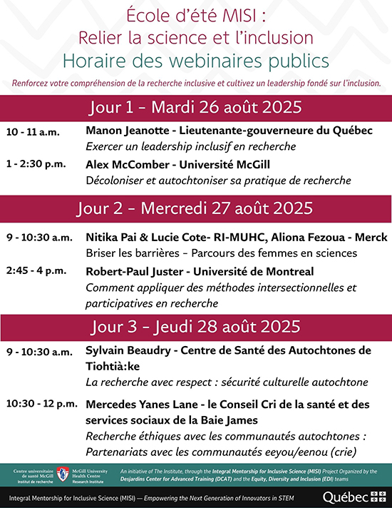 Du 26 au 28 août, les équipes EDI et DCAT de L’Institut vous invitent à une série de conférences virtuelles sur les pratiques de recherche inclusives et l’engagement éthique auprès des communautés autochtones. Cette série s’inscrit dans le cadre de l’École d’été : Relier la science et l’inclusion du projet Mentorat intégral pour la science inclusive (MISI), qui vise à accroître la participation et la réussite des femmes et des stagiaires autochtones dans la recherche en santé.