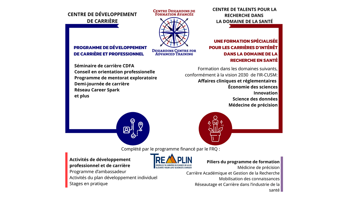 Le Centre Desjardins de formation avancée (CDFA) aide les stagiaires de l'Institut de recherche du Centre universitaire de santé McGill (L’Institut) à explorer divers cheminements de carrière. Grâce à des programmes de formation novateurs, le DCAT permet à ces chercheurs en santé d'acquérir des compétences et des connaissances avancées, les préparant ainsi à jouer un rôle important dans le milieu de la recherche et dans l'ensemble de l'écosystème de la santé et des sciences de la vie.
