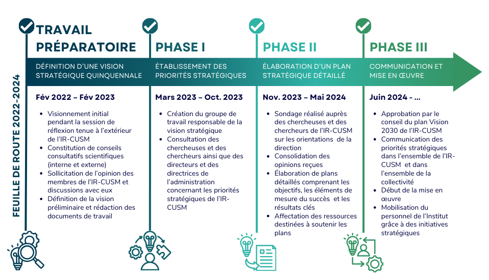 Après avoir obtenu l’approbation du conseil d’administration de L’Institut, nous nous concentrons sur l’élaboration d’un plan de mise en œuvre, afin de donner vie à notre vision ambitieuse. Ces plans de mise en œuvre décrira les résultats mesurables, les indicateurs de rendement clés (IRC) et comprendra les échéanciers afin que nous soyons en mesure d’exercer un suivi sur les progrès réalisés quant à nos cinq priorités en matière de recherche dans le domaine de la santé et quant à nos quatre priorités permettant la réalisation de projets.