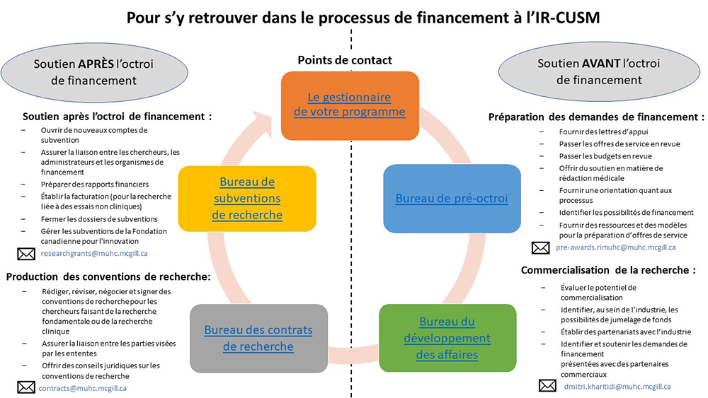 La division de Services de recherche publient les opportunités de financement, les ressources et bien plus encore sur le portail de l'IR-CUSM (intranet), accessible aux chercheurs, stagiaires et employés de l'IR-CUSM. (Demandez l'accès à l'aide du formulaire de demande d'accès au portail en ligne.)